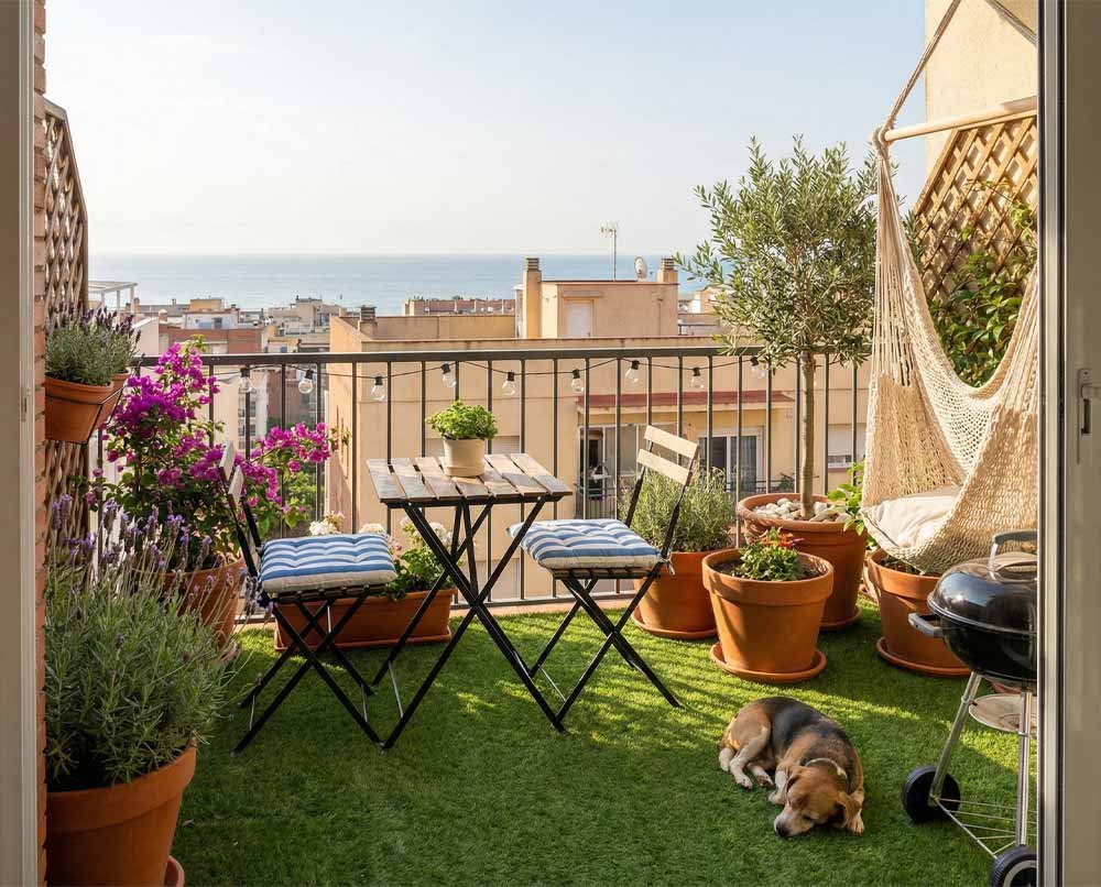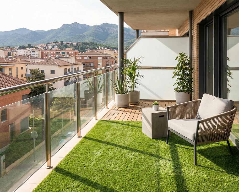 El césped artificial permite mejorar la estética del balcón sin realizar obras, aportando confort y un aspecto cuidado durante todo el año.