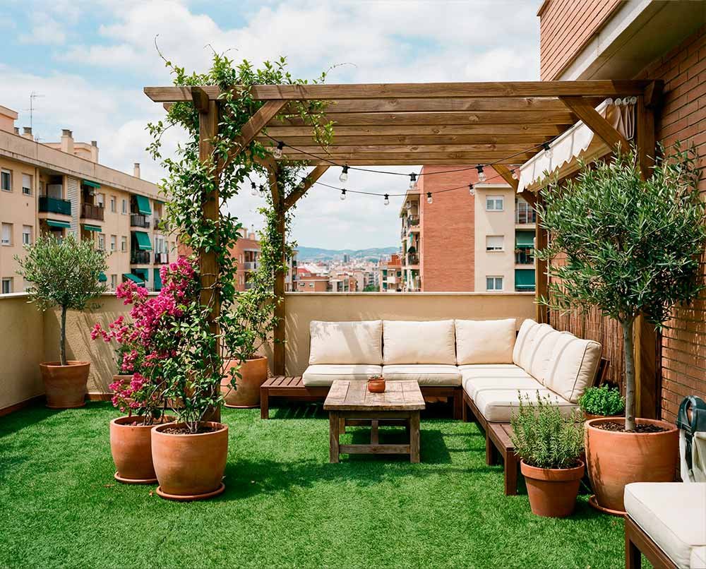 Si quieres un exterior bonito sin mantenimiento, o buscas una zona cómoda para niños o mascotas, el césped artificial suele ser una de las mejores opciones para terrazas en Barcelona.